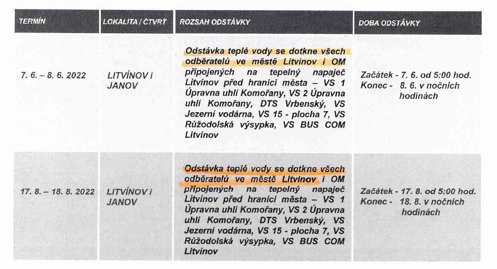 ODSTÁVKY TEPLÉ VODY PRO MĚSTO LITVÍNOV ROK 2022